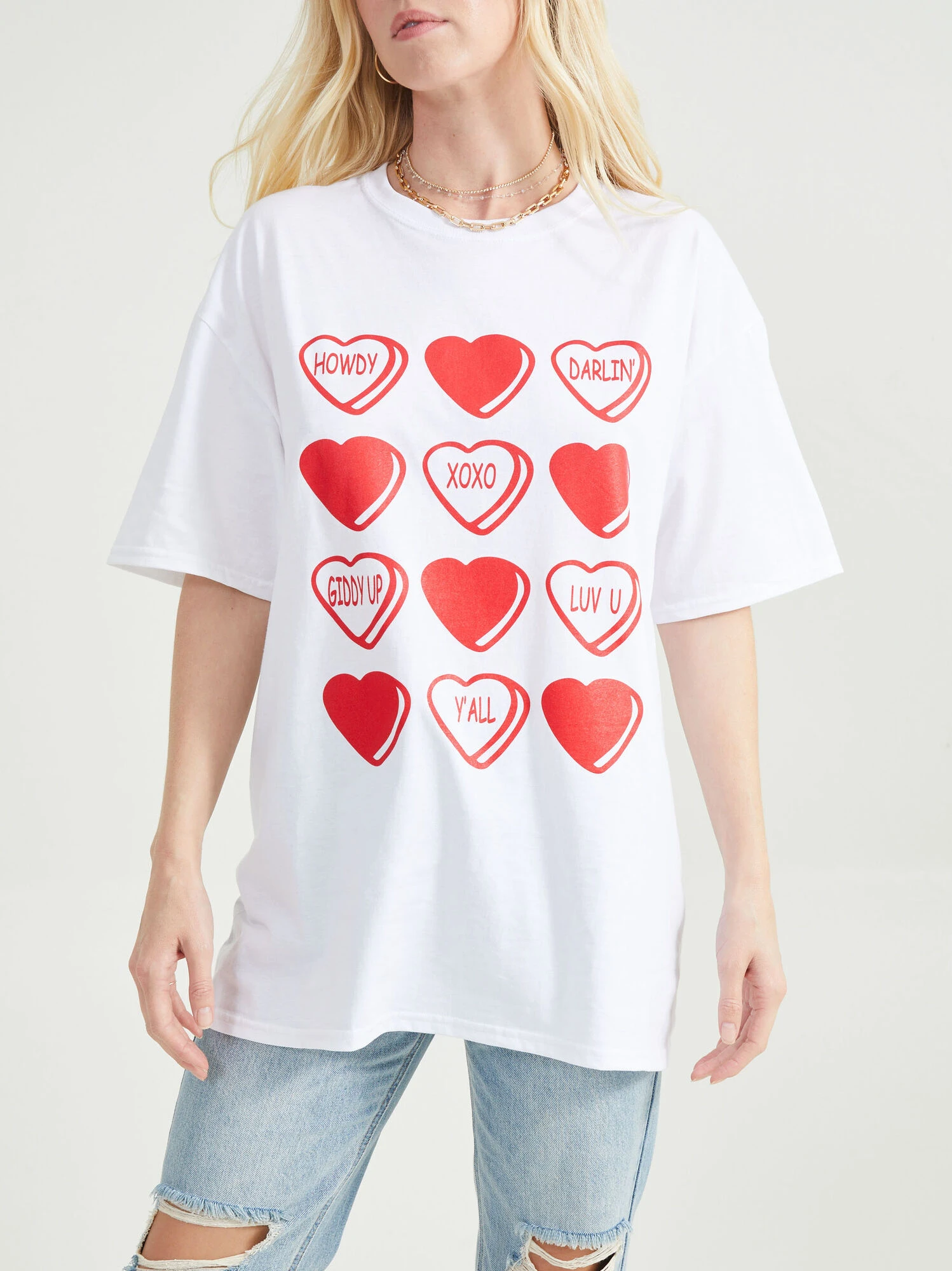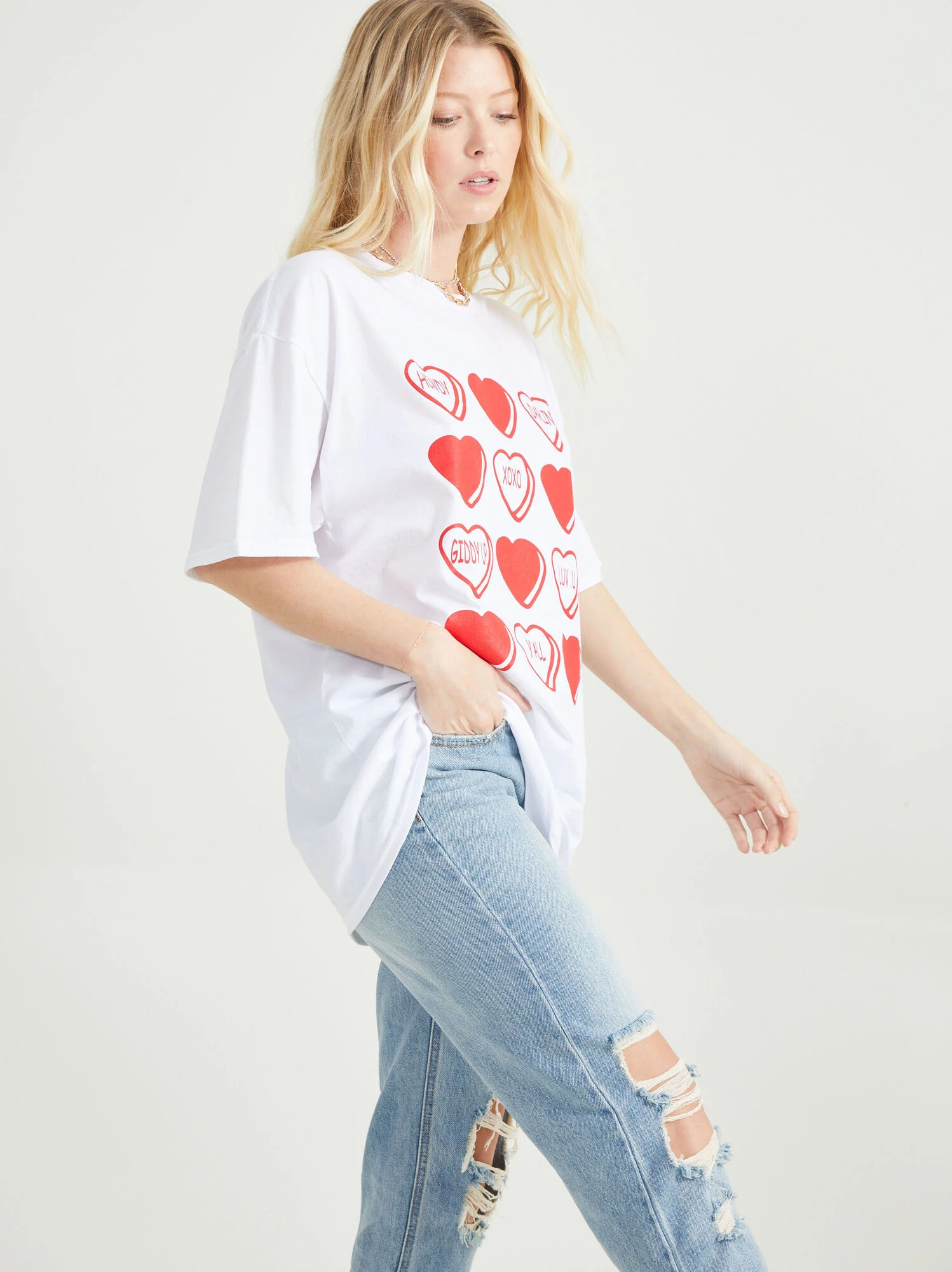 A trendy little tee shirt to sweeten up your outfits! You will constantly grab this adorable graphic’s sayings and candy hearts. It will look so cute layered under a puffer jacket with jeans, making up the cutest casual fit!