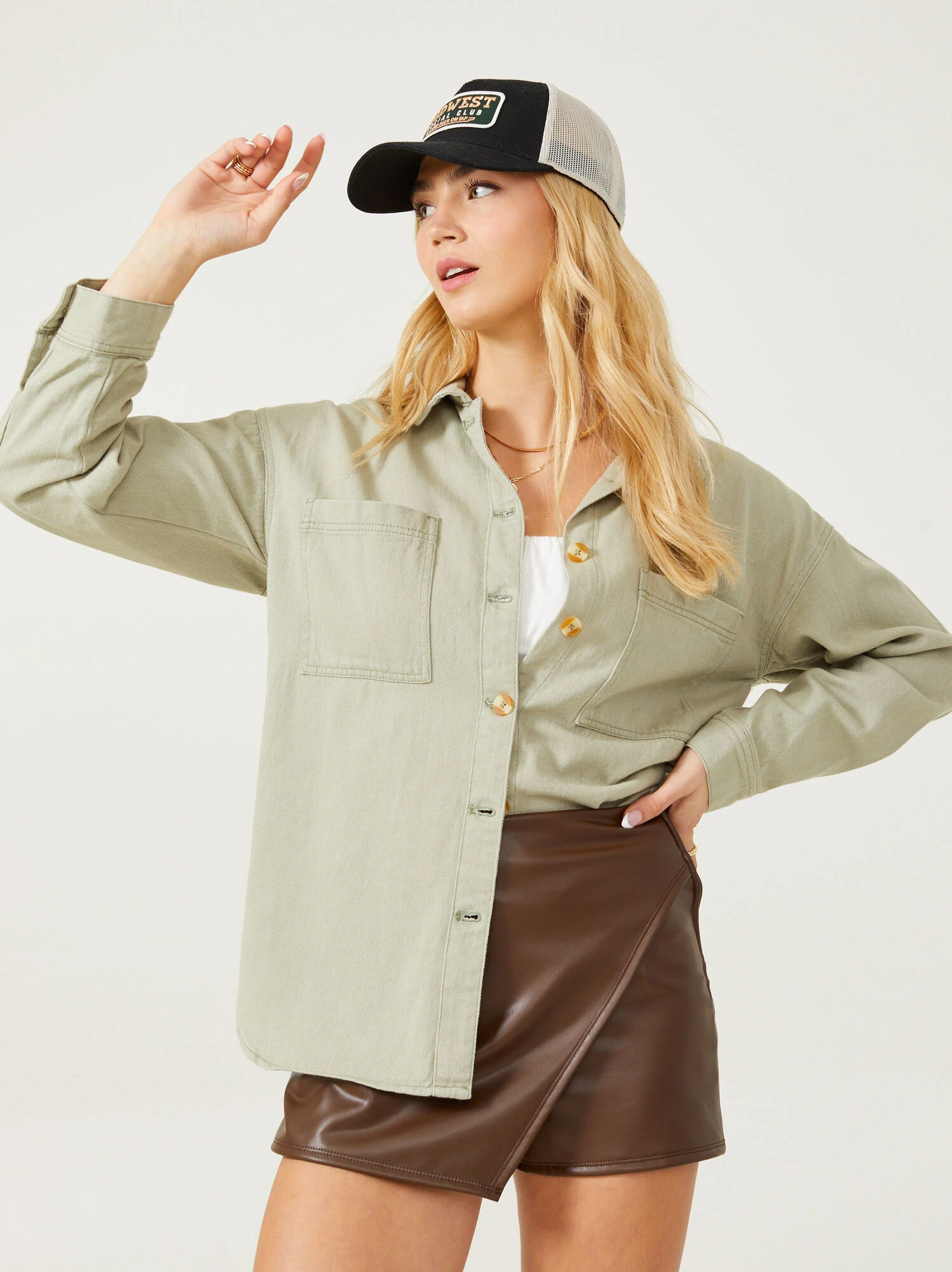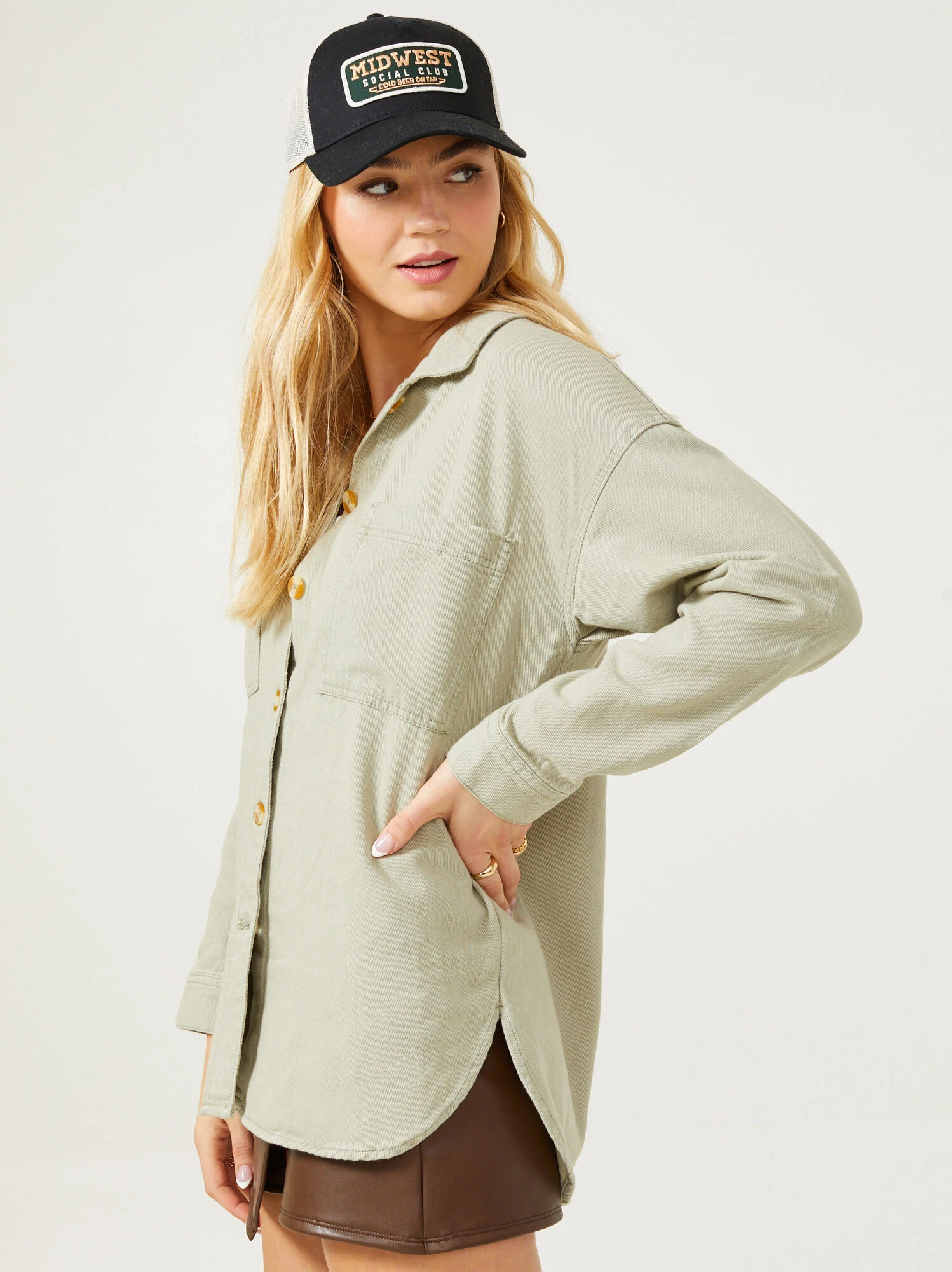 The Carson Twill Shacket is the transitional piece you’ll want to style again and again. It has a soft, yet structured, twill fabric, double pockets, and tortoise buttons that make it a cool-girl favorite. Its longer length makes it adorable to wear with a tank and leggings, or put it over a graphic tee and jeans!