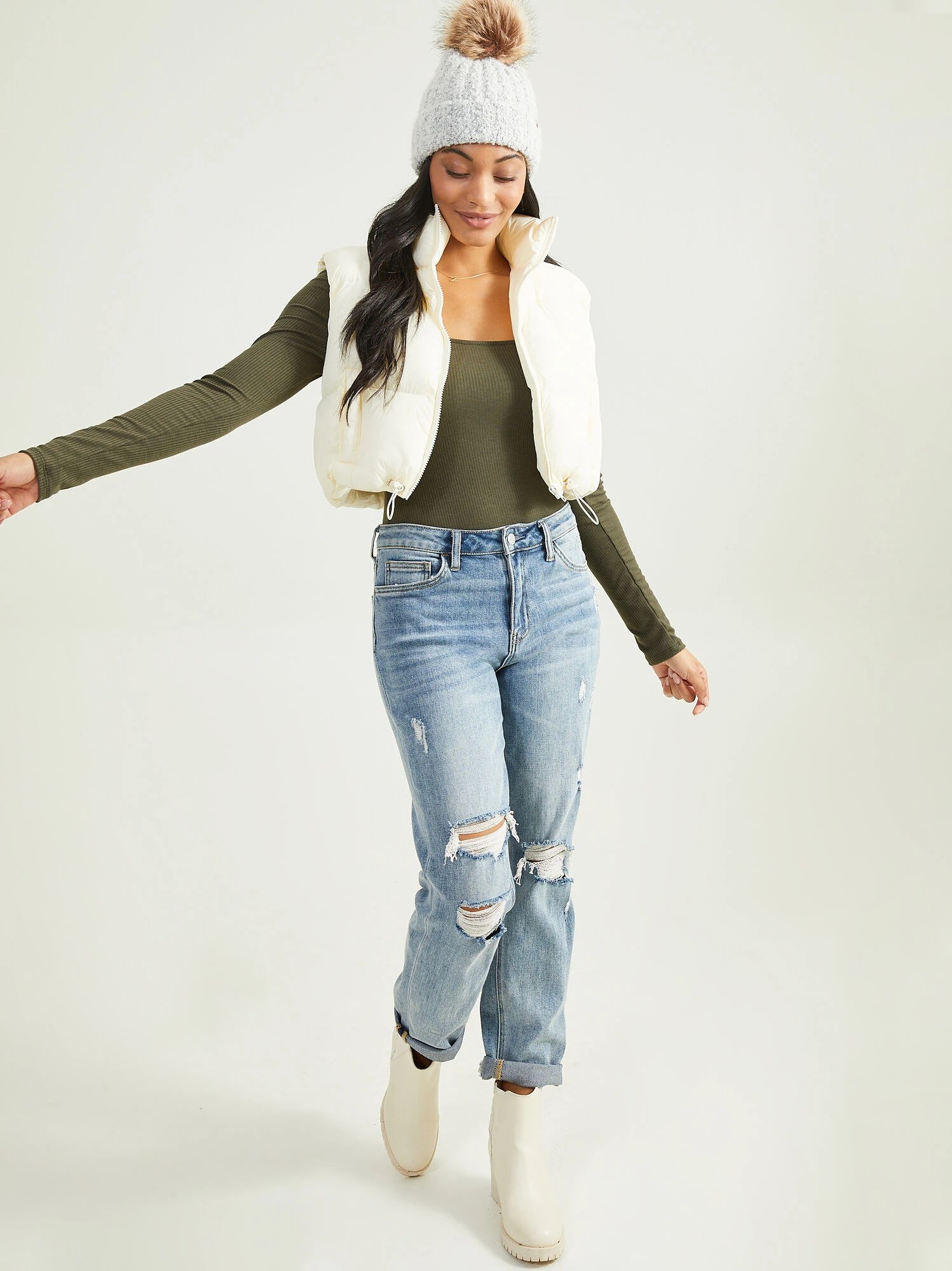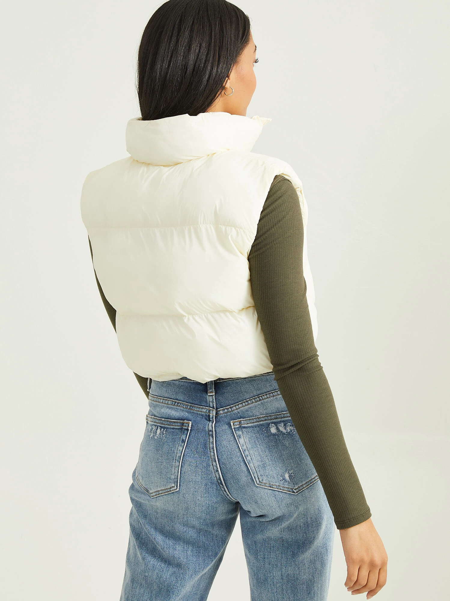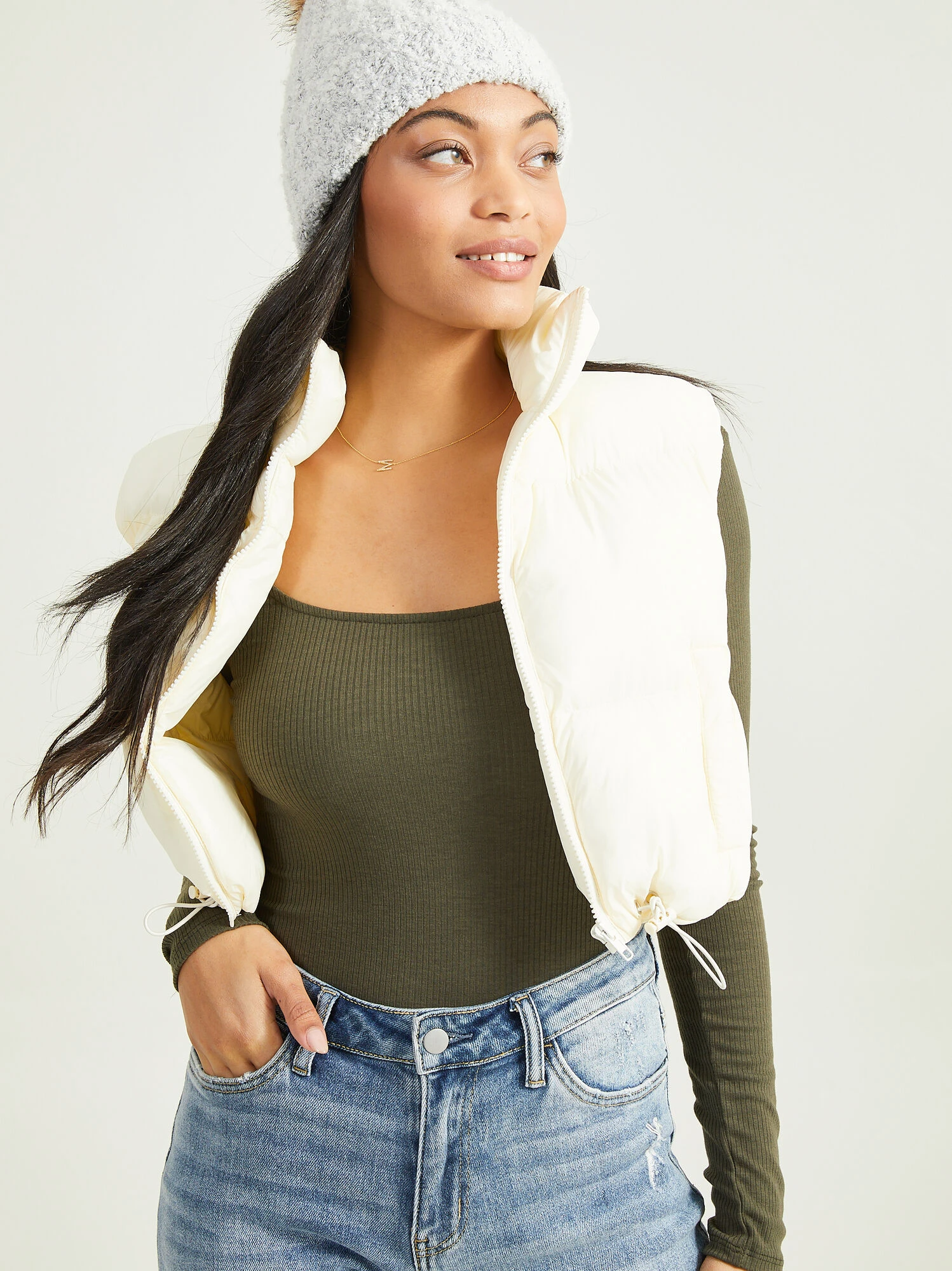 Stay cozy in the Ivy Cropped Puffer Vest — it is so soft and plush! Wear it with a ribbed long-sleeve shirt, jeans, and lug sole booties.