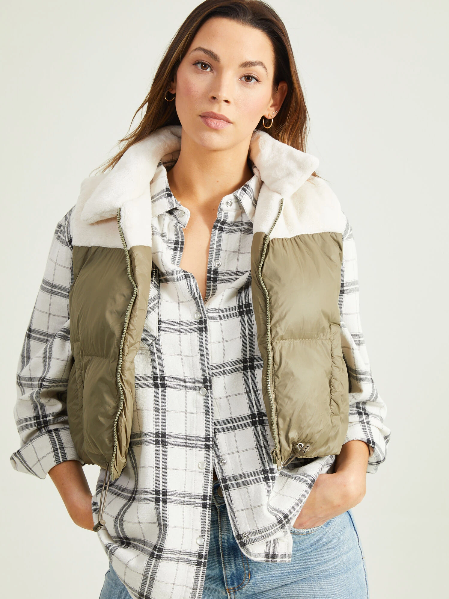 ONLINE EXCLUSIVE // The Julia Fur Puffer Vest is the best of both worlds! The split of colors and fabrics allows you to mix and match the vest with even more. You can cinch the bottom for a more customizable fit. The cropped style is so flattering and will pair great with any top or sweatshirt underneath.