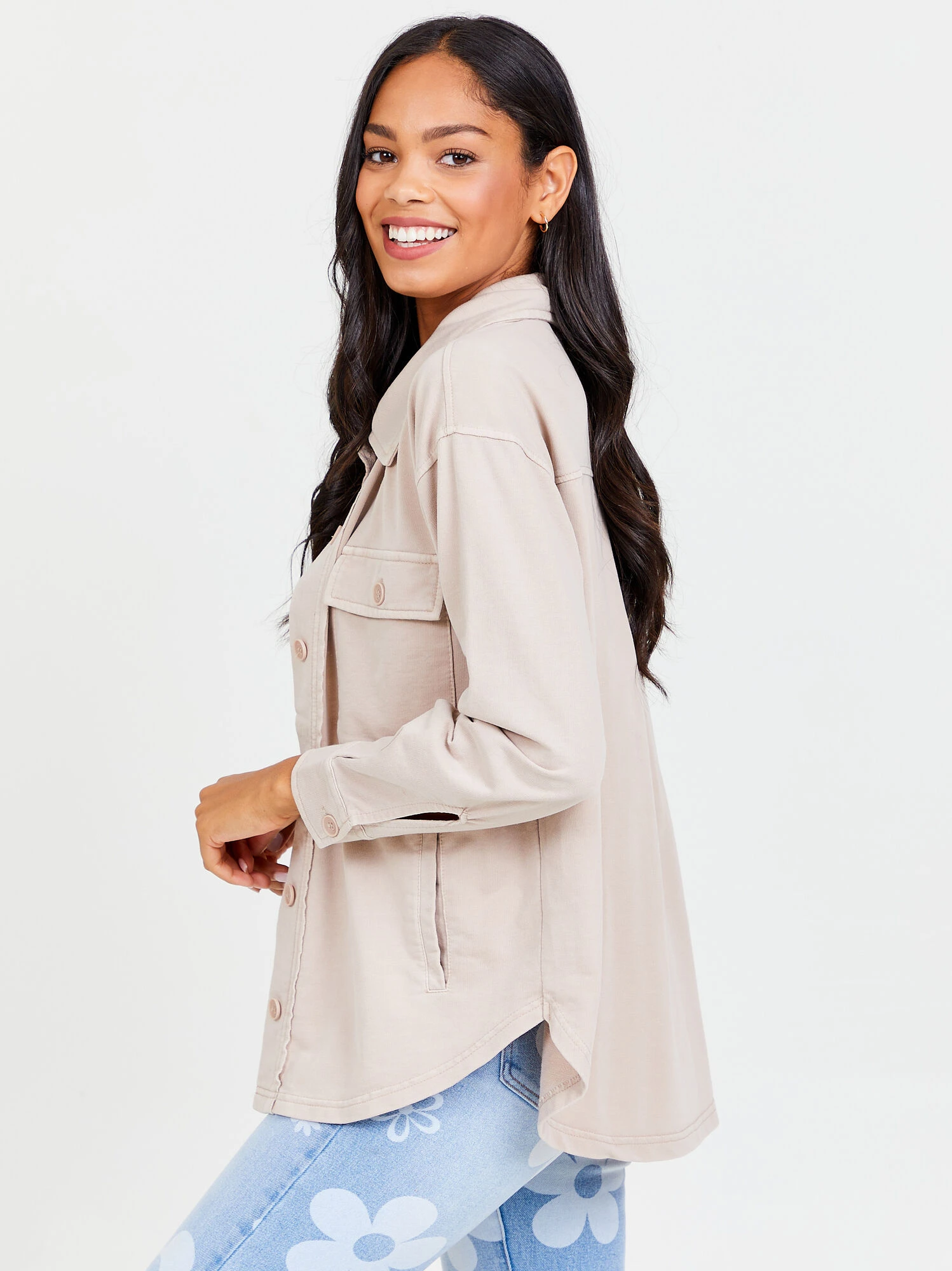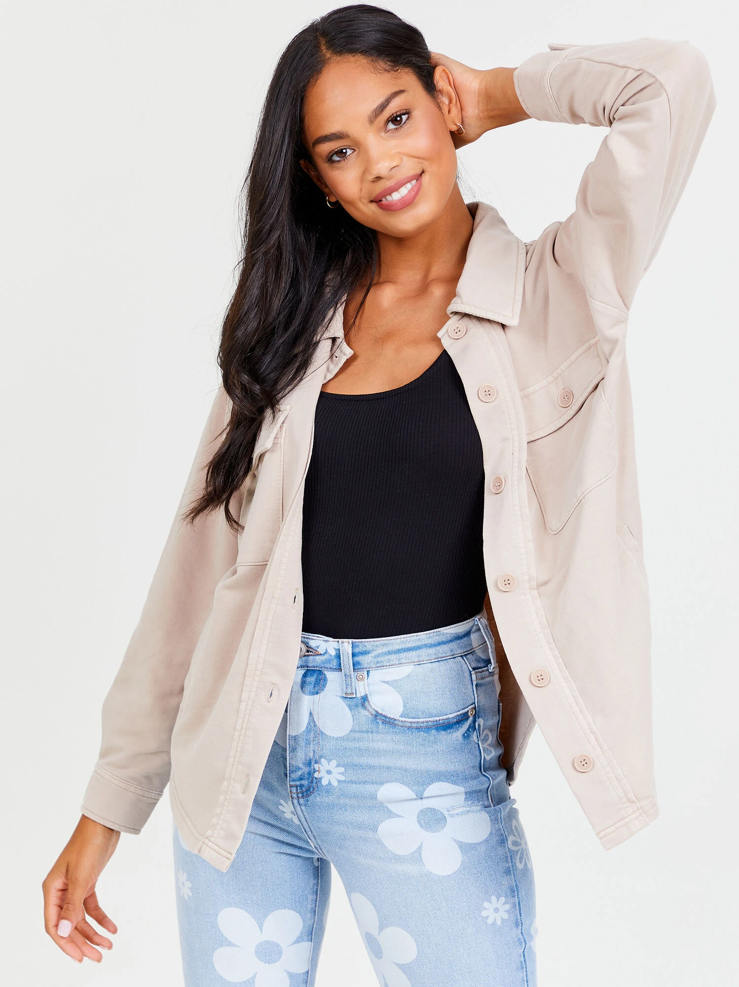 Learn to layer with this basic button down jacket! Pair it over a graphic tee to stay warm and stylish on a chilly day!