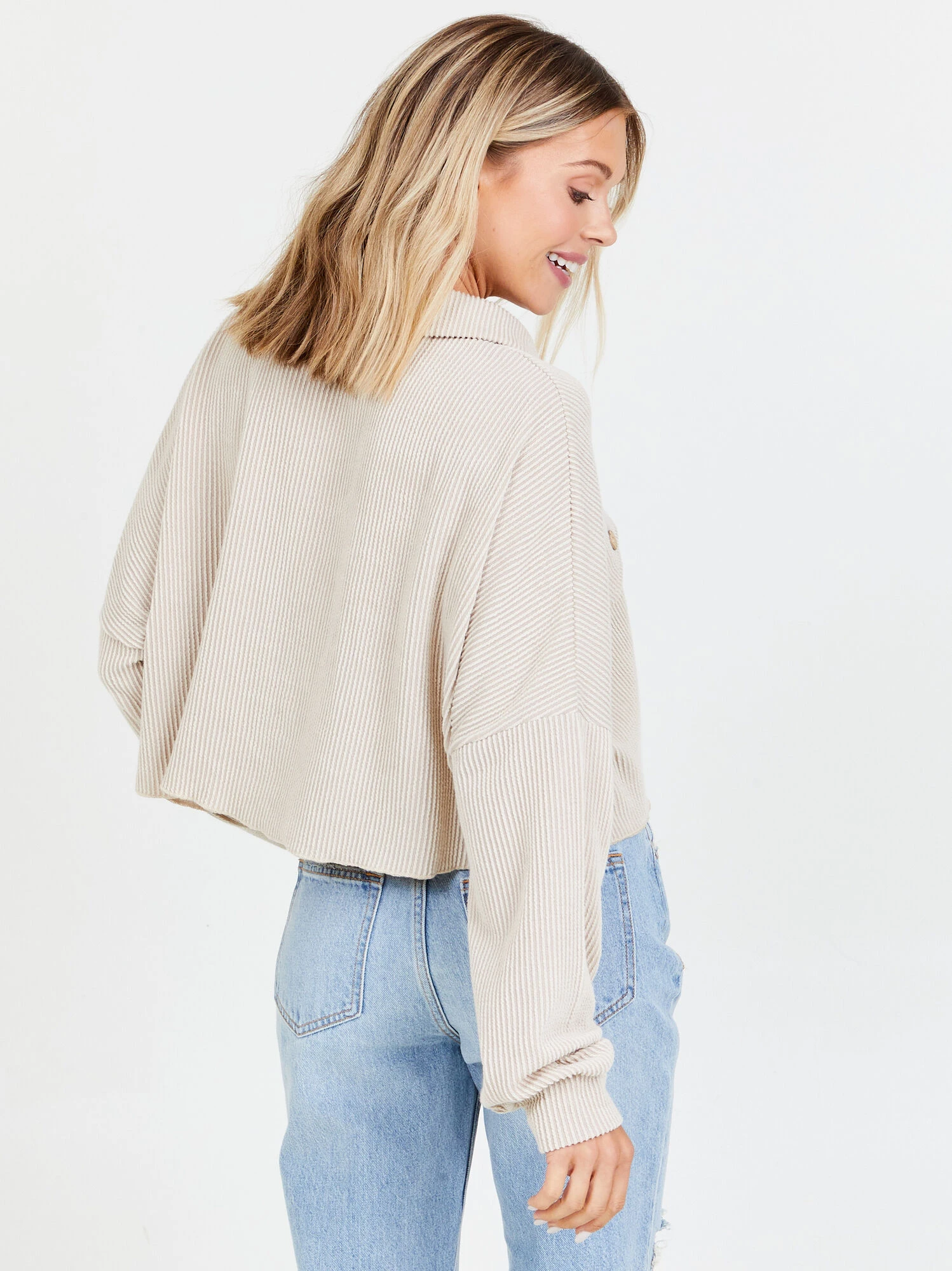 Cozy up in this cropped button shirt! The ribbed material and button detailing makes this the perfect layering piece for the colder months! Throw on a graphic tee underneath for an effortless look!