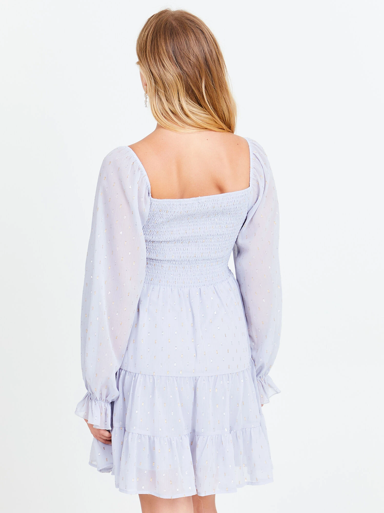 This dress has beautiful metallic pops of color that are perfect for any occasion! With a smocked top and flowy fit, this babydoll dress is so comfortable to wear.