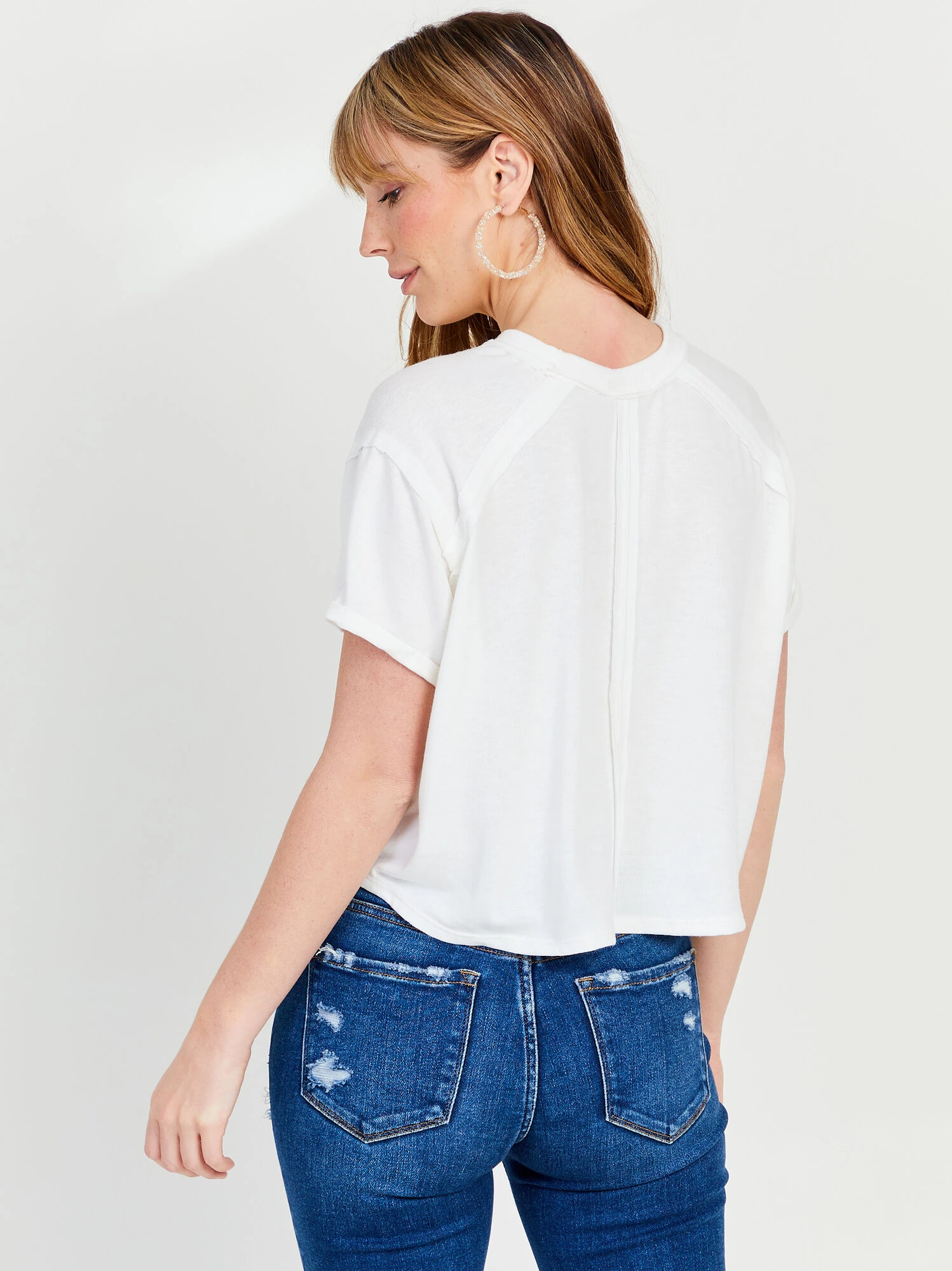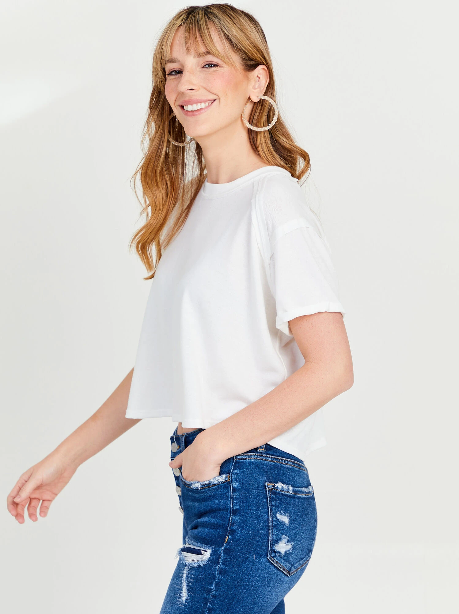 This relaxed cropped tee is so soft to the touch and so easy to style! The fit makes this perfect for leggings or high rise denim. Layer any of these with your favorite plaids this spring!